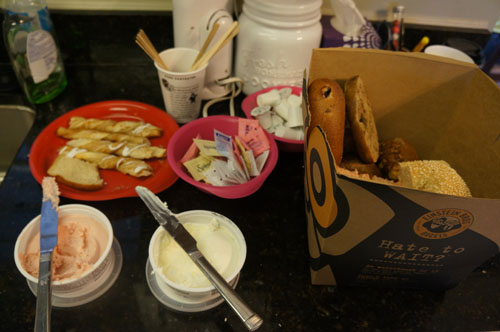 Afterwords we set out to find breakfast. We weren't sure where to go until Leah remembered this "pastry place" she heard about. Only problem was she didn't know where it was. So, we drove around for a while. Instead, fate took us to Einstein's where we received two free bagels with purchase of two beverages. We also got a cinnamon twist for Levi, but Noelle ended up eating it.